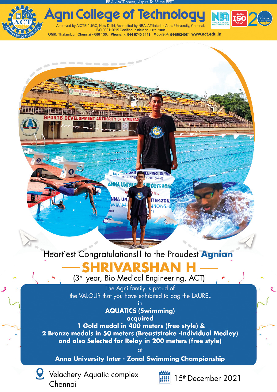 Srivarshan H ,from BIO MEDICAL awarded  1 Gold medal in 400 meters (free style) & 2 Bronze medals in 50 meters (Breaststroke -Individual Medley)  and also Selected for Relay in 200 meters (free style)  at Anna University Inter – zonal Swimming championship