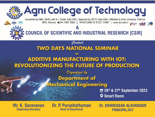 Two Days National Seminar on Additive Manufacturing with IoT: Revolutionizing the Future of Production Read More » September 26, 2023