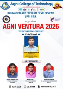 The Innovation and Product Development (IPD) Cell of Agni College of Technology successfully organized Agni Ventura 2026 on 10 January 2026, a dynamic platform designed to foster innovation, entrepreneurial thinking, and product-oriented problem solving among students.