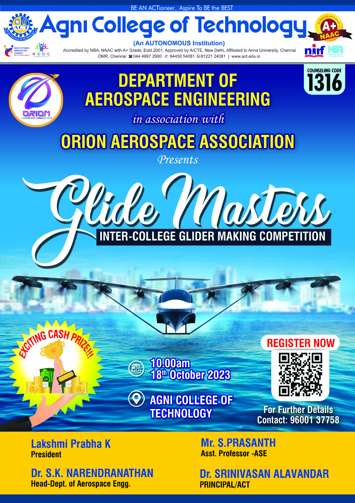 In the event of Dr. A P J Abdul Kalam’s Birthday, the Department of Aerospace Engineering along with Orion Aerospace Association of Agni College of Technology is organizing “Glide Masters”, an inter-college Glider Making Competition.