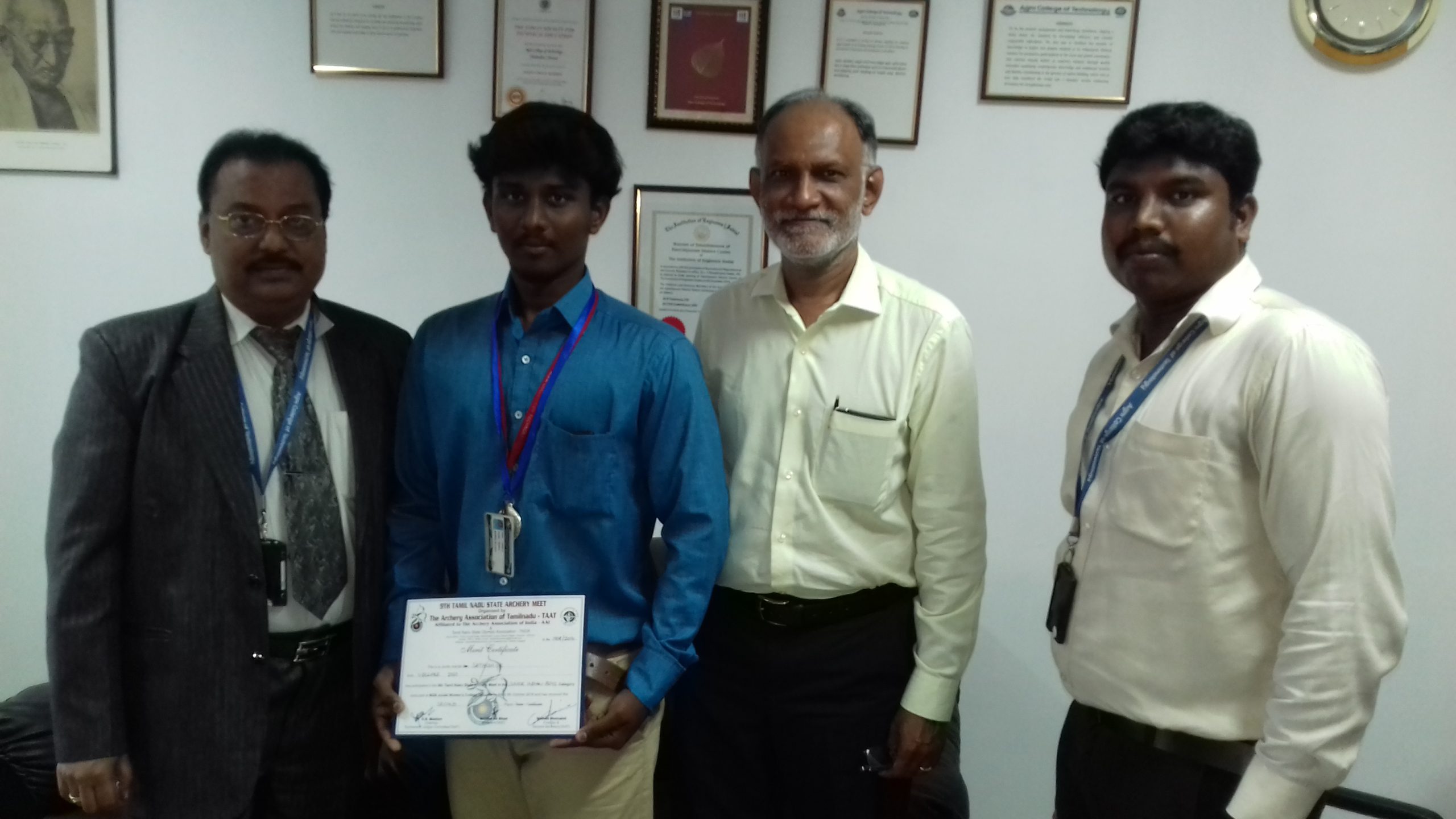 Mr.Sathish K from III year Mechanical Engineering particiapated in 9th Tamil Nadu State Archery Meet in Junior Indian Boys Category conducted at MGR Janaki Women's College Ground on 8th and 9th October 2016 and has received the Second Place.